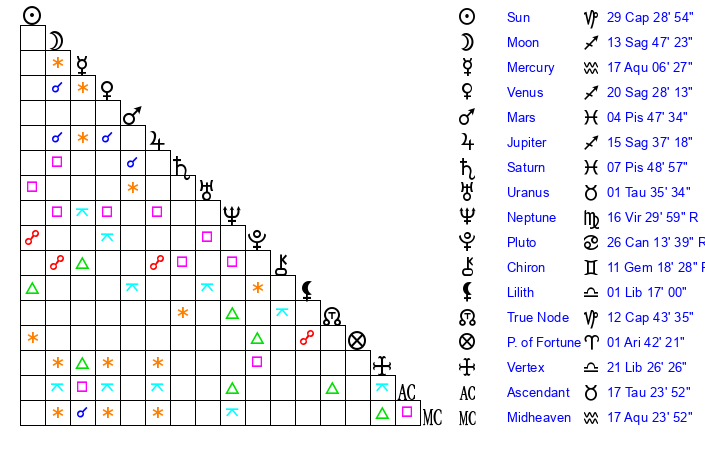 | Sun | 29 Capricorn 28 | 0 Aquarius 53 | 28 Aries 28 |