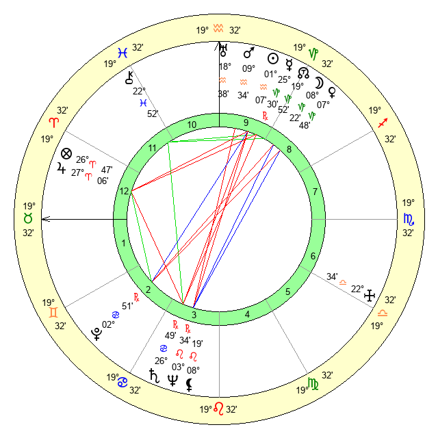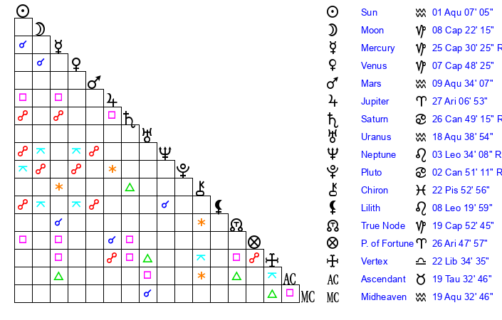 | Venus | 7 Capricorn 48 | 18 Pisces 34 | 21 Taurus 59 |