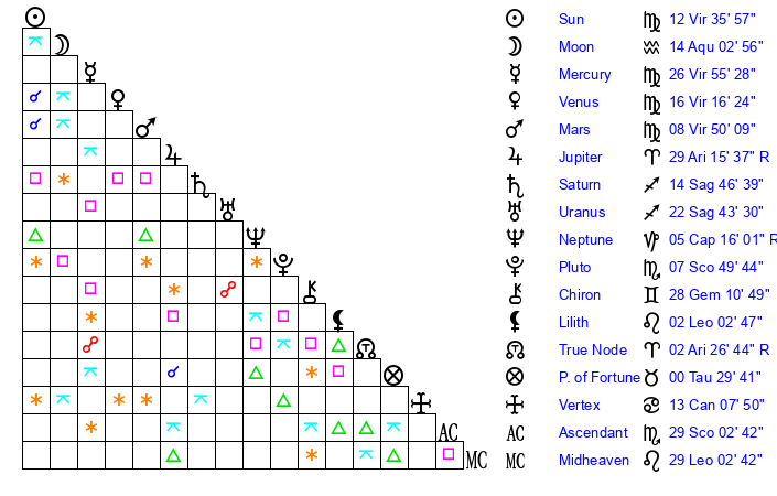 Mercury | 26 Virgo 56 | 6 Virgo 5 | 12 Scorpio 41 |