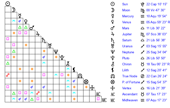 | Venus | 6 Aquarius 0 | 23 Capricorn 56 | 27 Capricorn 21 |