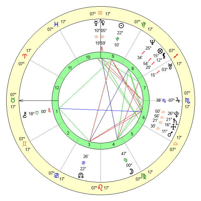 | Moon | 0 Virgo 44 | 14 Scorpio 50 | 29 Pisces 18 |
