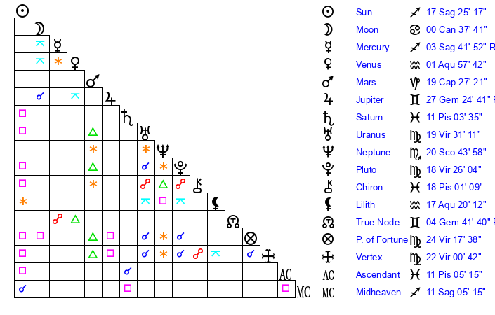 Pluto | 18 Virgo 27 | 0 Aquarius 25 | 17 Virgo 54 |