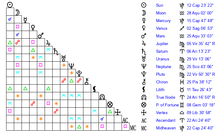| Sun | 12 Capricorn 23 | 13 Capricorn 19 | 11 Pisces 11 |
