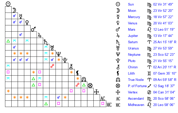 Sun | 2 Virgo 32 | 2 Virgo 45 | 28 Libra 22 |