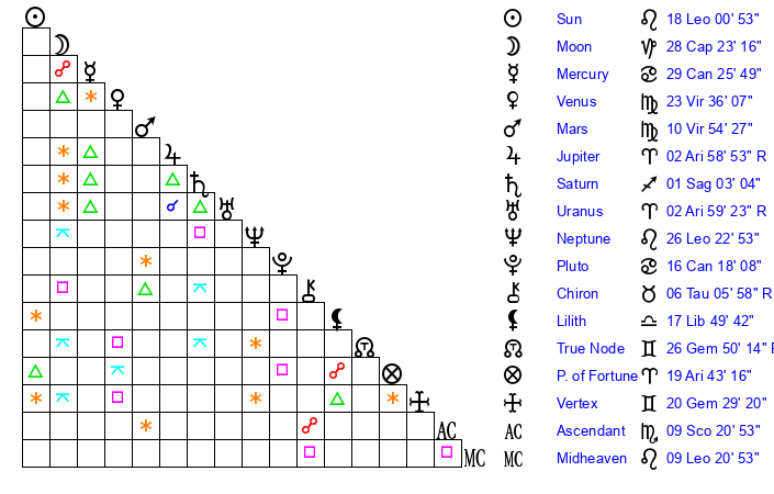 | Neptune | 26 Leo 23 | 1 Aries 48 | 29 Leo 8 |