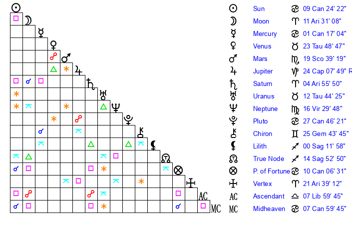 | Moon | 11 Aries 24 | 27 Virgo 56 | 10 Cancer 7 |