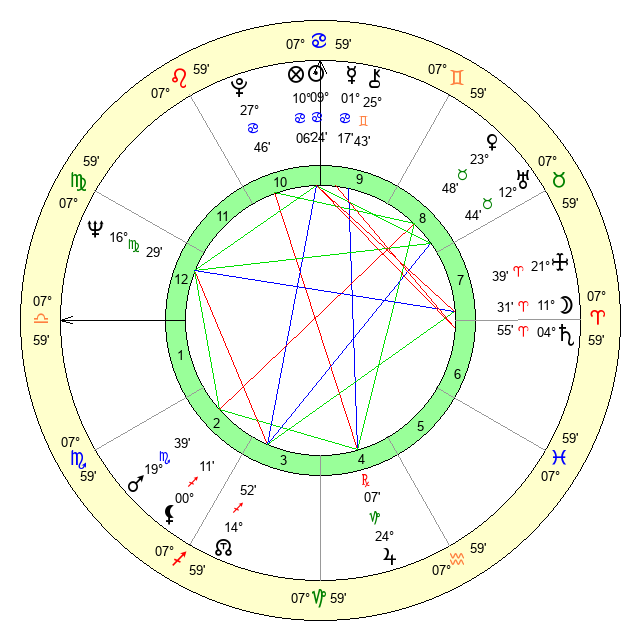 | Sun | 9 Cancer 24 | 10 Cancer 6 | 4 Libra 9 |