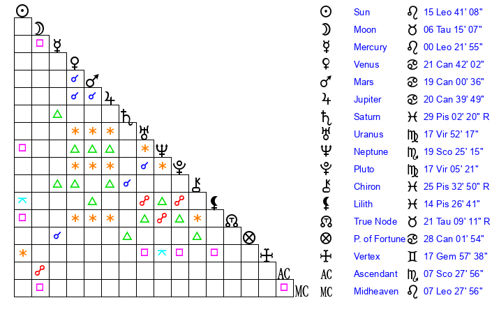 Moon | 6 Taurus 8 | 8 Aquarius 41 | 2 Cancer 30 |