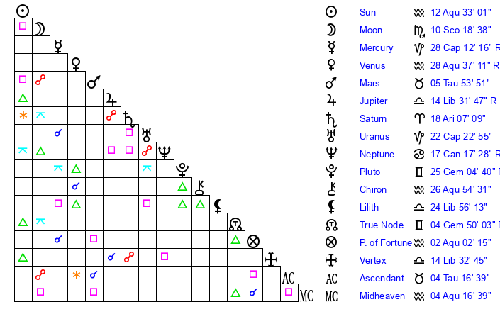 | Sun | 12 Aquarius 33 | 13 Aquarius 39 | 6 Gemini 3 |