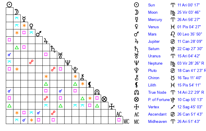 | Mercury | 26 Aries 57 | 28 Pisces 21 | 17 Cancer 36 |