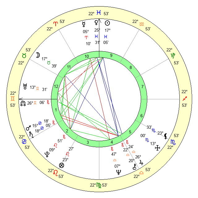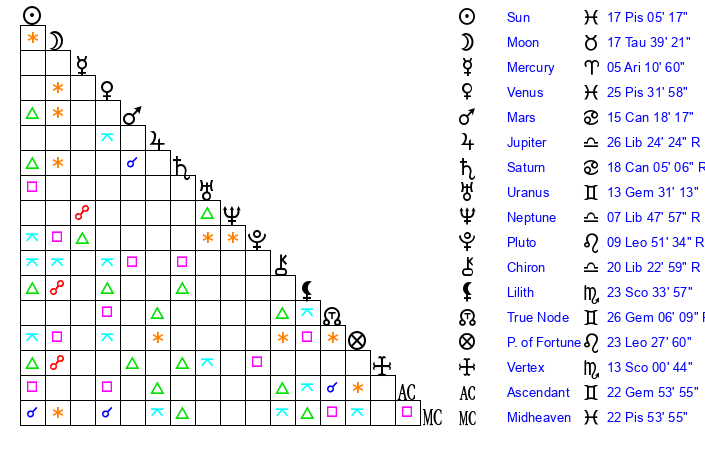| Sun | 17 Pisces 5 | 17 Pisces 56 | 4 Gemini 25 |