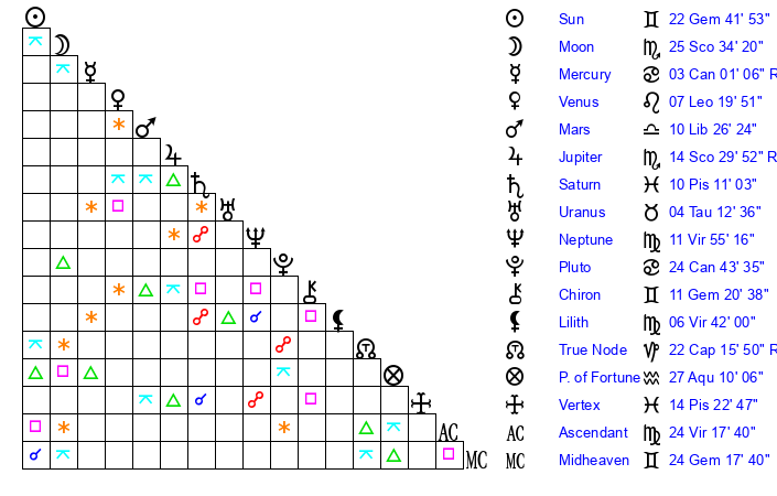 | Sun | 22 Gemini 41 | 23 Gemini 53 | 18 Virgo 59 |