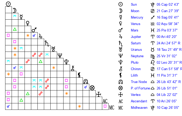 | Sun | 5 Capricorn 3 | 6 Capricorn 26 | 0 Aries 56 |