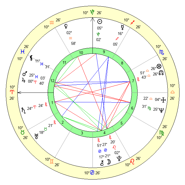 | Moon | 21 Cancer 18 | 28 Scorpio 31 | 1 Virgo 10 |
