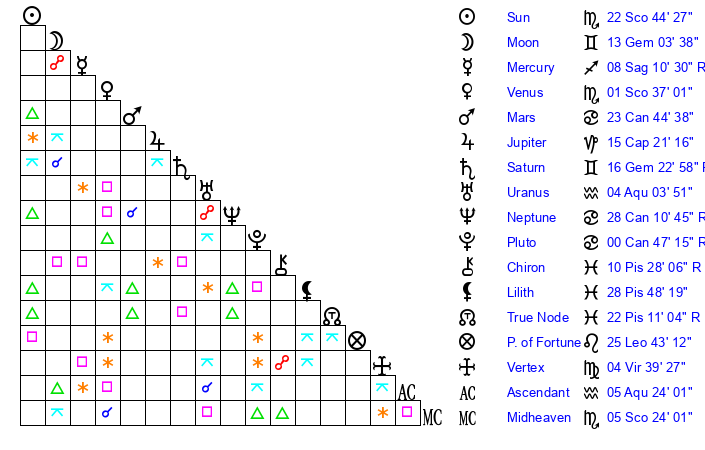 | Sun | 22 Scorpio 44 | 23 Scorpio 49 | 15 Pisces 17 |