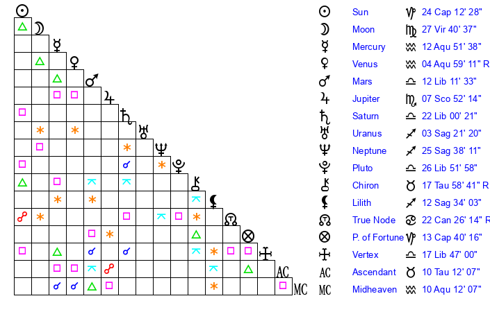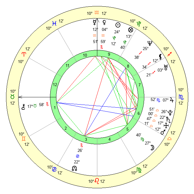 | Moon | 27 Virgo 40 | 8 Sagittarius 32 | 26 Aries 48 |