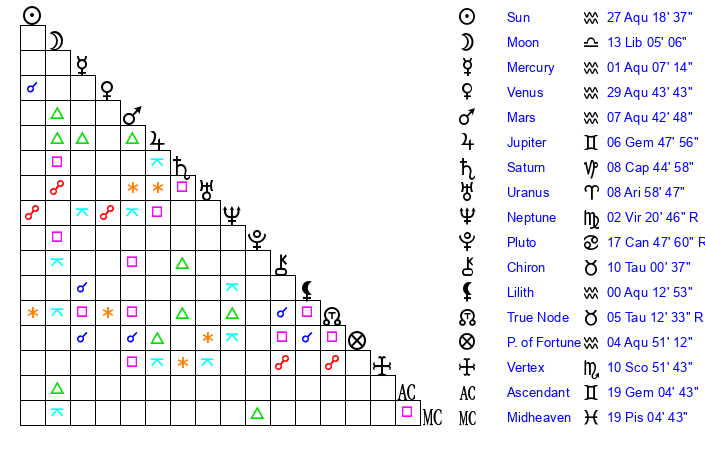 | Sun | 27 Aquarius 19 | 28 Aquarius 16 | 0 Gemini 52 |