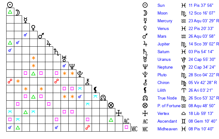 Mercury | 23 Aquarius 3 | 28 Pisces 37 | 18 Pisces 40 |