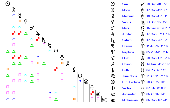 | Moon | 12 Capricorn 48 | 11 Virgo 44 | 10 Gemini 6 |