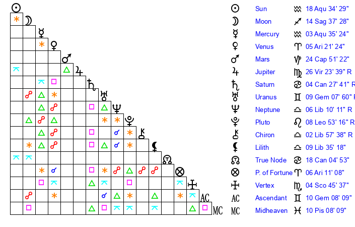 | Sun | 18 Aquarius 35 | 19 Aquarius 10 | 8 Taurus 2 |