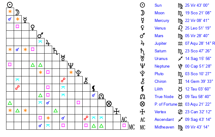 | Moon | 19 Scorpio 12 | 19 Leo 25 | 4 Taurus 55 |