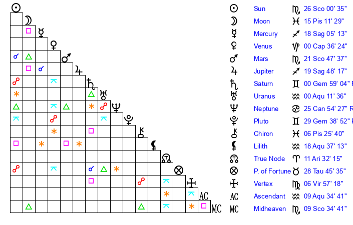 Sun | 26 Scorpio 1 | 26 Scorpio 51 | 19 Pisces 32 |