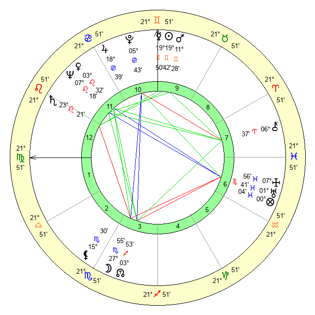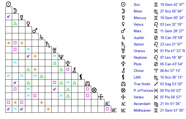 | Sun | 19 Gemini 42 | 21 Gemini 1 | 1 Libra 34 |