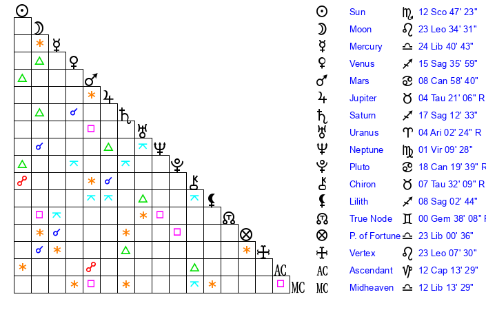 | Sun | 12 Scorpio 48 | 13 Scorpio 17 | 21 Aquarius 15 |