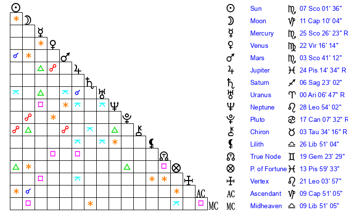 | Moon | 11 Capricorn 11 | 29 Aquarius 36 | 23 Leo 55 |
