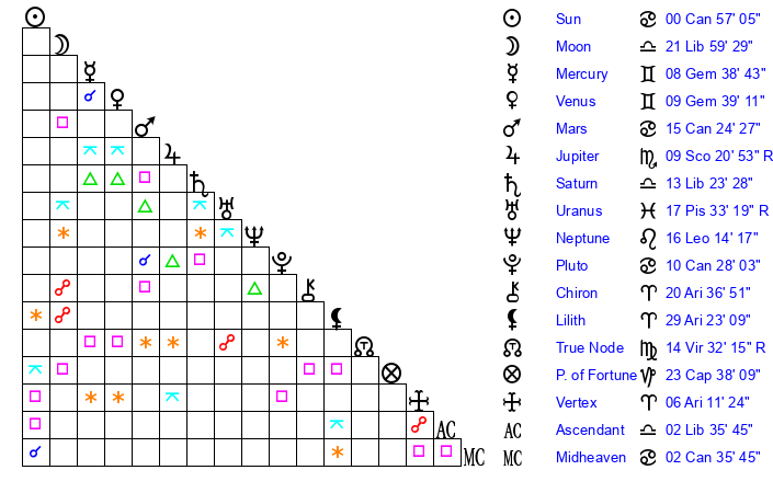| Sun | 0 Cancer 57 | 2 Cancer 14 | 9 Libra 12 |