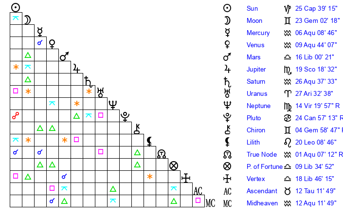 | Mercury | 6 Aquarius 9 | 12 Capricorn 9 | 14 Aries 20 |