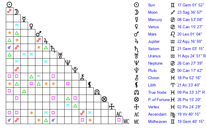 | Jupiter | 21 Aquarius 58 | 29 Gemini 44 | 12 Aquarius 21 |
