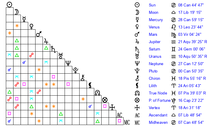 | Pluto | 0 Cancer 51 | 3 Aquarius 7 | 2 Cancer 10 |