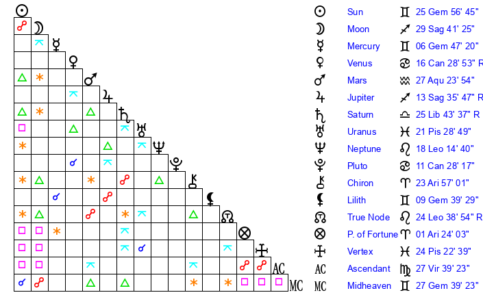 | Moon | 29 Sagittarius 40 | 9 Pisces 20 | 3 Virgo 14 |