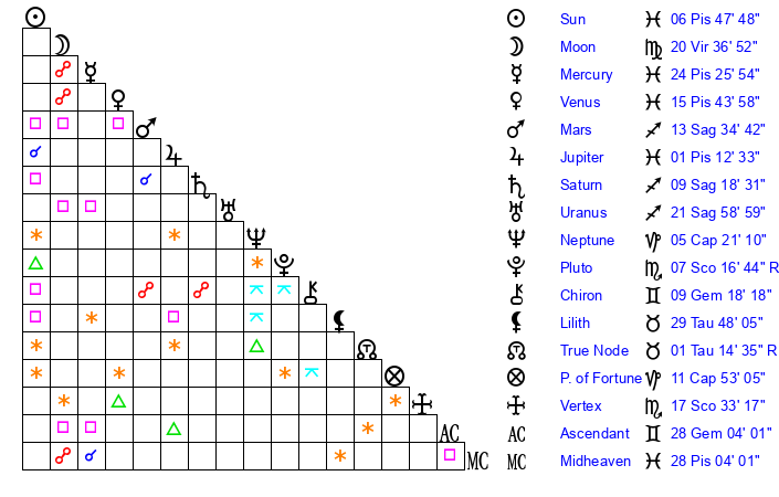 | Sun | 6 Pisces 48 | 7 Pisces 20 | 15 Aries 37 |