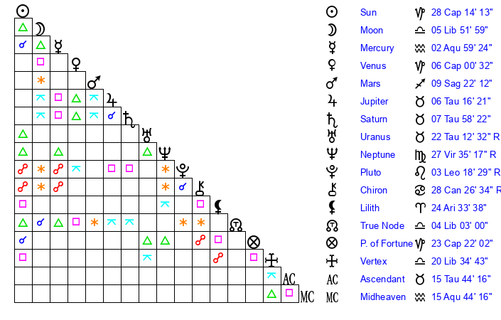| Saturn | 8 Taurus 9 | 15 Pisces 59 | 14 Taurus 52 |