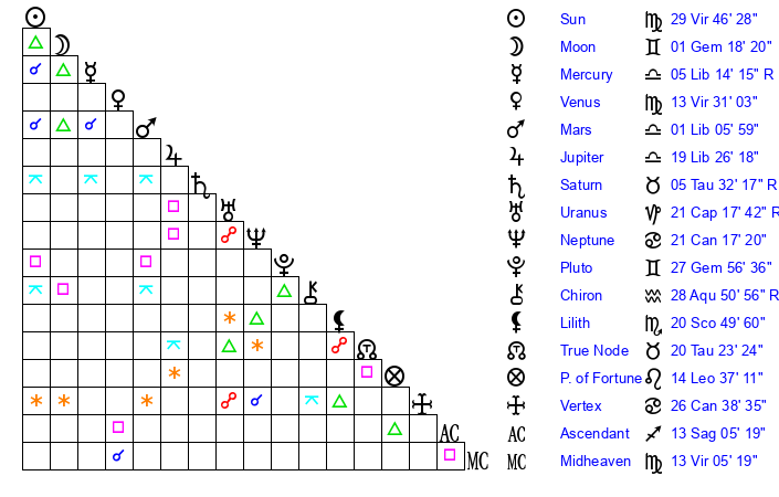 | Sun | 29 Virgo 46 | 0 Libra 55 | 25 Capricorn 28 |