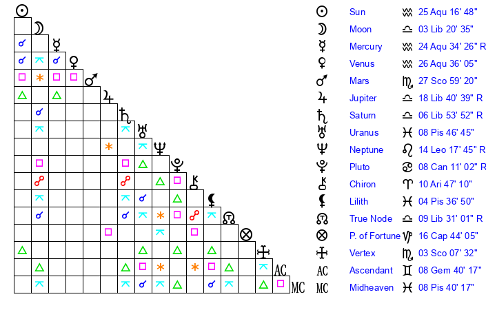 | Sun | 25 Aquarius 17 | 26 Aquarius 18 | 6 Gemini 36 |