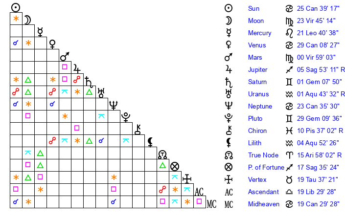 Sun | 25 Cancer 39 | 26 Cancer 19 | 15 Scorpio 56 |
