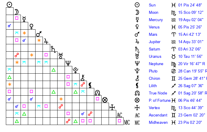 | Jupiter | 14 Aquarius 29 | 11 Gemini 43 | 0 Pisces 24 |