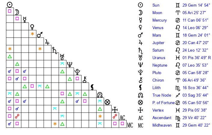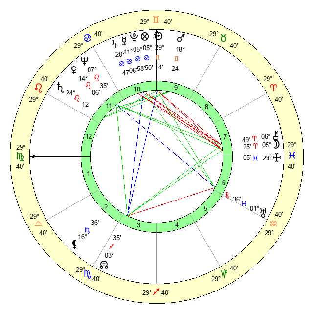 | Sun | 29 Gemini 15 | 0 Cancer 34 | 11 Libra 23 |