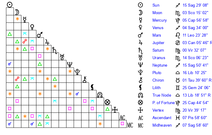 | Neptune | 15 Sagittarius 51 | 29 Pisces 22 | 17 Sagittarius 30 |