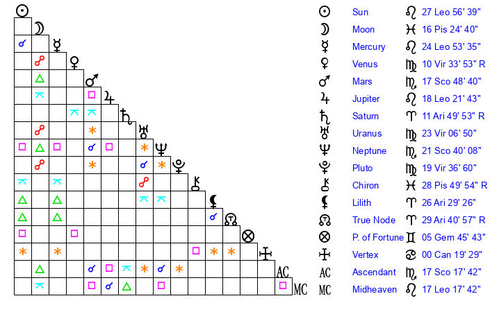 Moon | 16 Pisces 21 | 9 Leo 47 | 27 Aries 41 |
