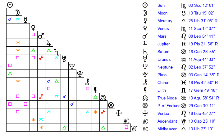 | Sun | 0 Scorpio 12 | 1 Scorpio 32 | 21 Aquarius 39 |