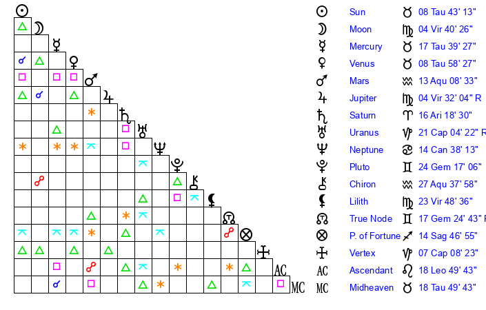 | Venus | 8 Taurus 59 | 29 Pisces 27 | 0 Libra 50 |