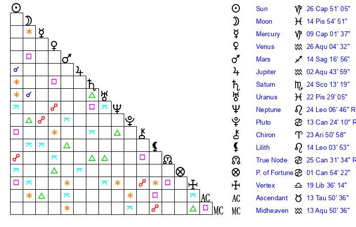 | Pluto | 13 Cancer 24 | 1 Aquarius 35 | 12 Cancer 46 |
