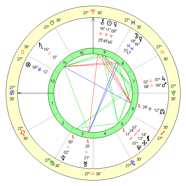 | Venus | 9 Aries 45 | 27 Pisces 13 | 13 Gemini 56 |