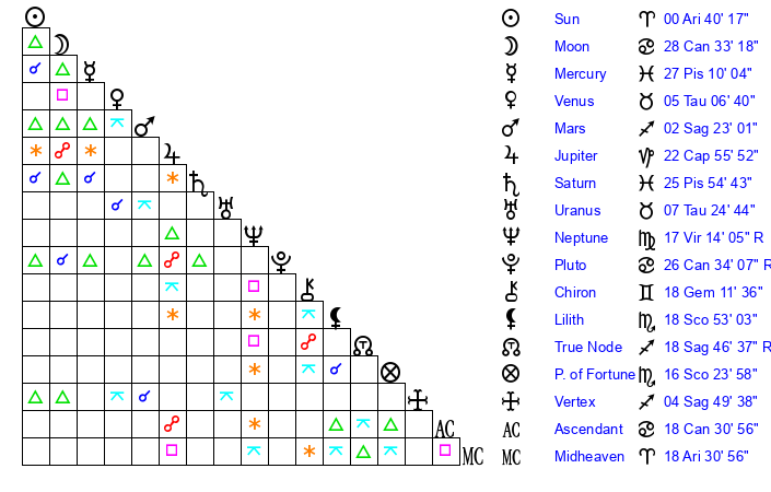 | Sun | 0 Aries 40 | 1 Aries 20 | 26 Gemini 3 |