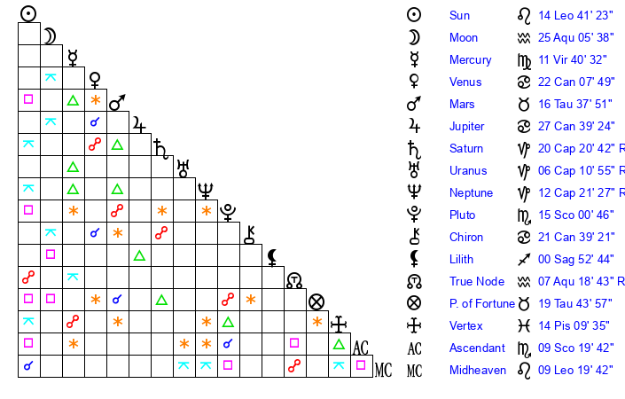 Sun | 14 Leo 41 | 15 Leo 12 | 18 Virgo 27 |