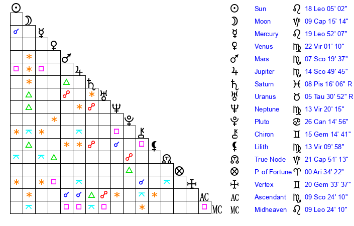 | Sun | 18 Leo 5 | 19 Leo 16 | 16 Scorpio 22 |